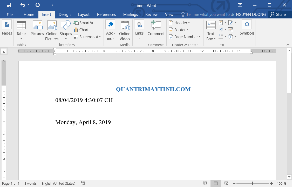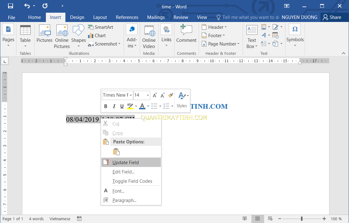 Cách chèn ngày giờ hiện tại vào văn bản Word