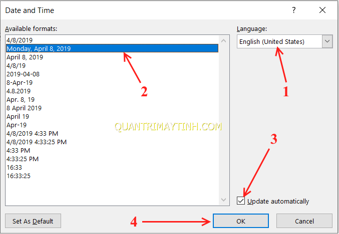 - Ô Update automatically: Nếu bạn đánh dấu tích vào ô này thì thời gian sẽ được tự động cập nhật sau khi bạn thoát rồi mở lại văn bản